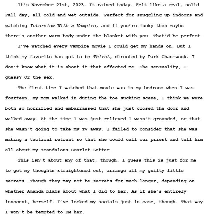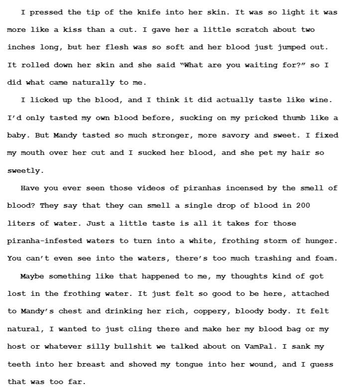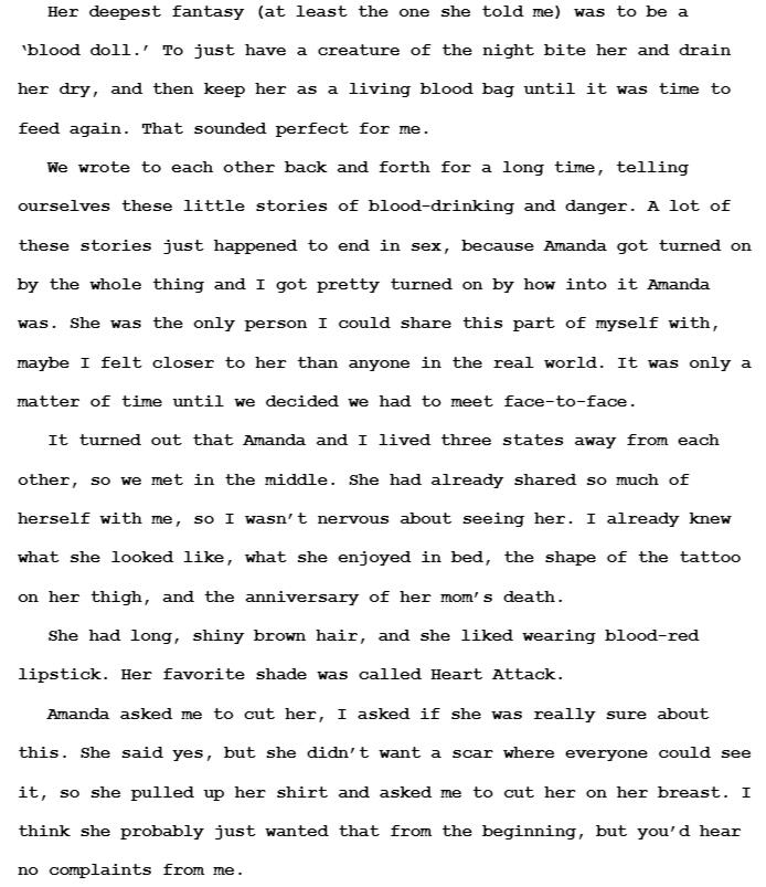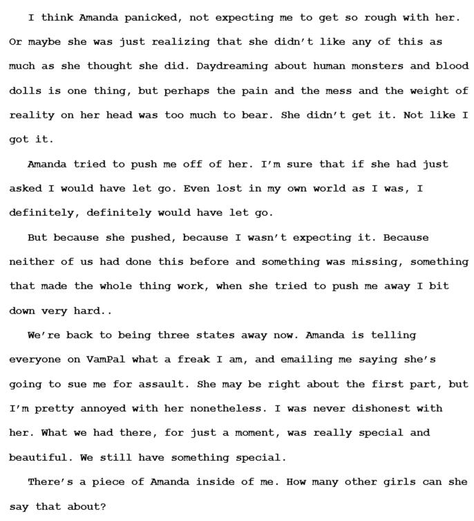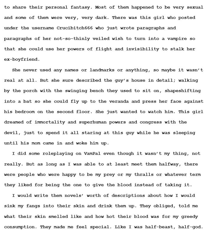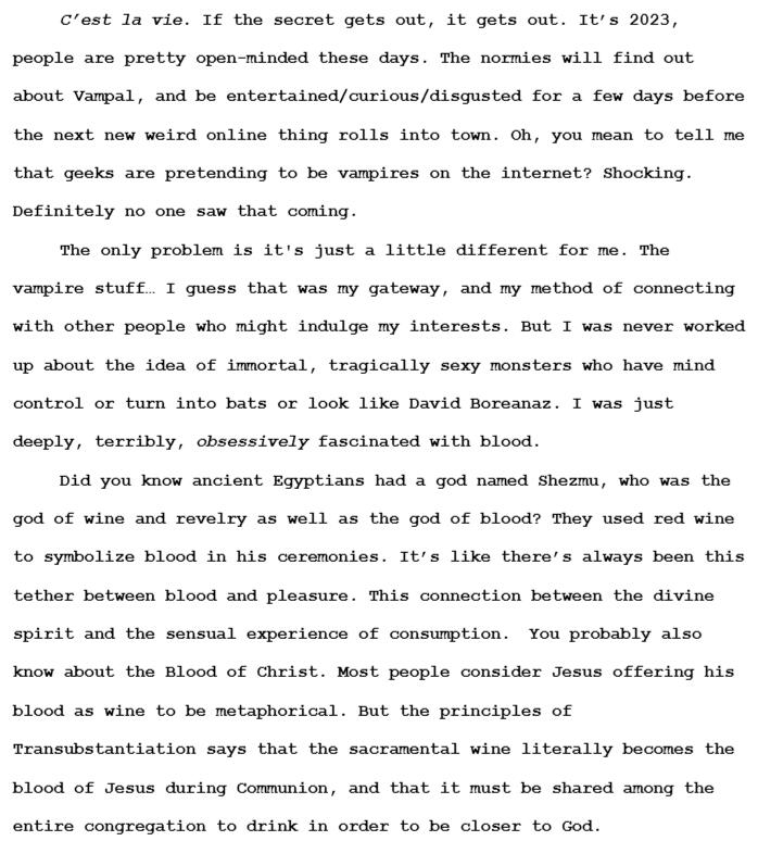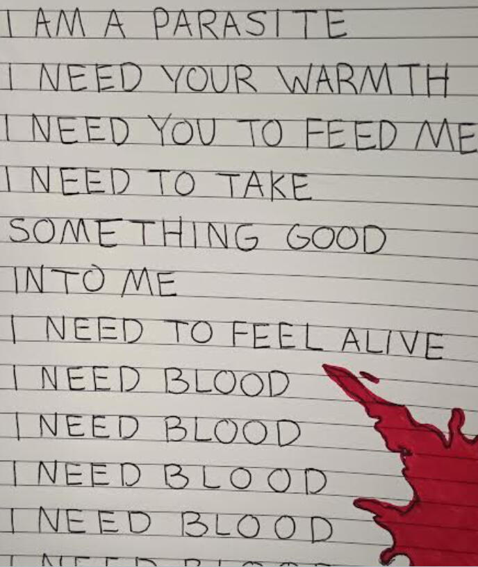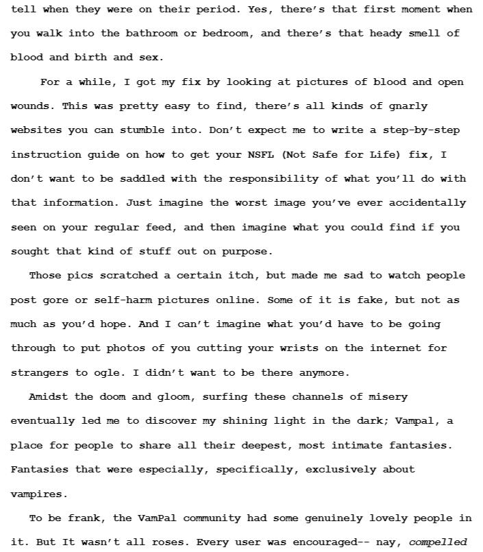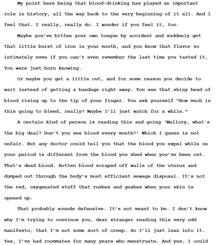 A lonely woman's fascination with a certain bodily fluid leads her down a dark path of NSFL blogs, online roleplay forums, and a dangerous romance. This half-letter size zine contains 12 pages, 1 short story, 2 poems and 1 incriminating discourse thread about vampires. Each zine is hand-made and unique. May have minor imperfections.